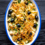 The list of cod dishes in Portugal is huge, but some preparations are classic. Bacalhau com Natas is one of them, stamped in Portuguese houses and taverns around the country. The dish is nothing more than a gratin made with chips of cod, onion and chips of potato covered with bechamel sauce and cream. It is super creamy and yields a lot, great for family lunch.