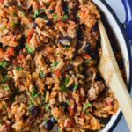 Portuguese Spiced Potatoes (Batatas Com Chouriço) is a hearty and flavorful traditional dish that has a place on every Portuguese table! The potatoes are braised in a savory tomato and white wine broth until they are velvety and tender. The vegan sausage adds a rich depth of flavor to the broth as it cooks with the potatoes. The resulting liquid is perfect for sopping up with crusty bread.